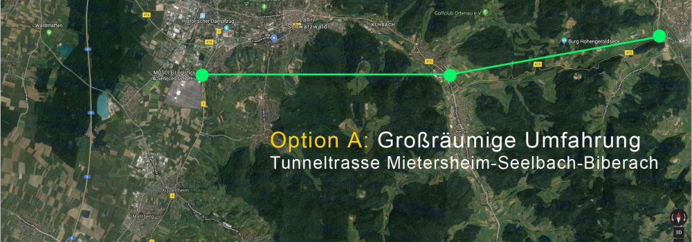 Der Verkehr wird durch einen Tunnel von Mietersheim bis Seelbach und von dort weiter über einen zweiten Tunnel bis Biberach geführt. - Die Variante (a) ist bisher in keiner öffentlichen Planung berücksichtigt.