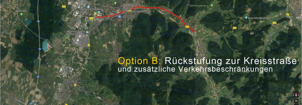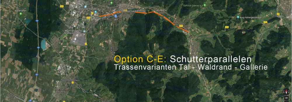 Nachteile: - Eingriff in die Natur des Schuttertals. Teilweiser Verlust von Naherholungsgebiet. Die Umsetzung kann sich durch starker Gegenwehr von Umweltverbänden und Bürgerinitiativen stark verzögern. Keine Entlastung von Lahr. Höhere Kosten.