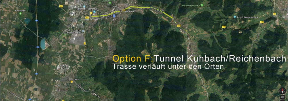 Diese Tunneltrasse basiert auf einer Tunnelstudie von 2002, die im Auftrag der Stadt Lahr entstand. Die Tunnellänge beträgt dabei ca. 1,2km unterhalb von Kuhbach und 1,4km unterhalb von Reichenbach. Jeweils an den Ortseinfahrten und –ausfahren der beiden Ortsteile sind dabei die Tunnelportale gelegen, für die aktuell eine Machbarkeitsuntersuchung in Bearbeitung ist. - Vorteile: